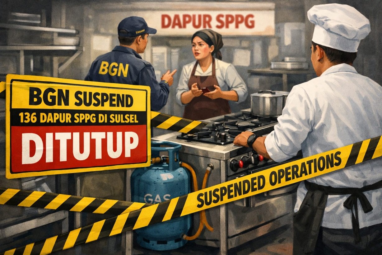 ZATERA.ID | MAKASSAR — Badan Gizi Nasional (BGN) mengambil langkah tegas dengan menghentikan sementara operasional ratusan dapur program Makan Bergizi Gratis (MBG) di Sulawesi Selatan.