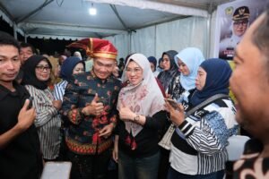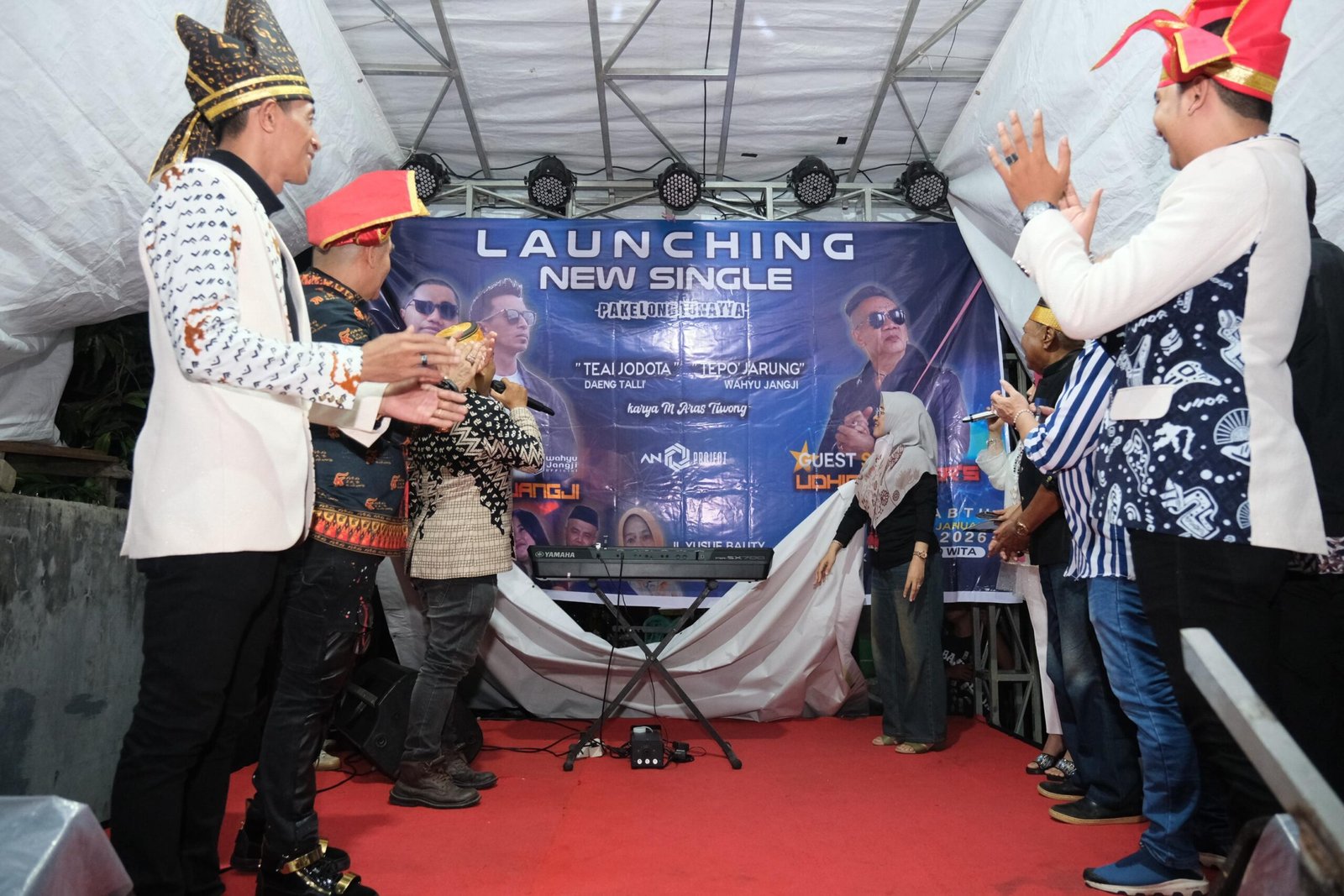 GOWA — Bupati Gowa, Sitti Husniah Talenrang menghadiri launching single terbaru “Teai Jodota” karya Daeng Talli dan “Tepo’ Jarung” karya Wahyu Jangji di Perumahan Gowa Lestari, Sabtu (3/1/2025) malam.