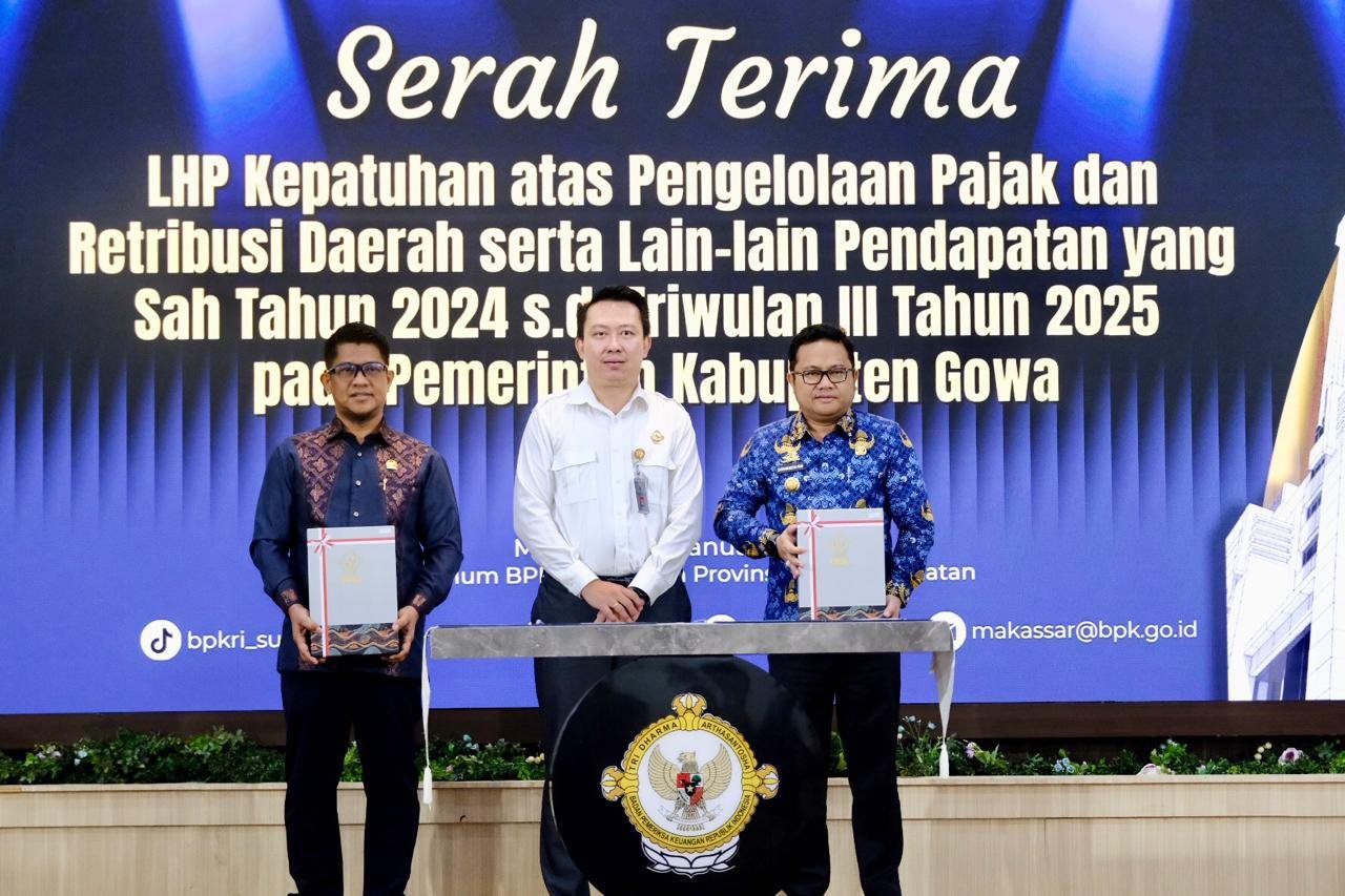 GOWA — Pemerintah Kabupaten (Pemkab) Gowa menerima Laporan Hasil Pemeriksaan Kepatuhan atas Pengelolaan Pajak dan Retribusi Daerah Tahun 2024 hingga Triwulan III Tahun 2025 dari Badan Pemeriksa Keuangan Perwakilan Provinsi Sulawesi Selatan di Auditorium BPK Perwakilan Provinsi Sulawesi Selatan, Senin (19/1/2026).