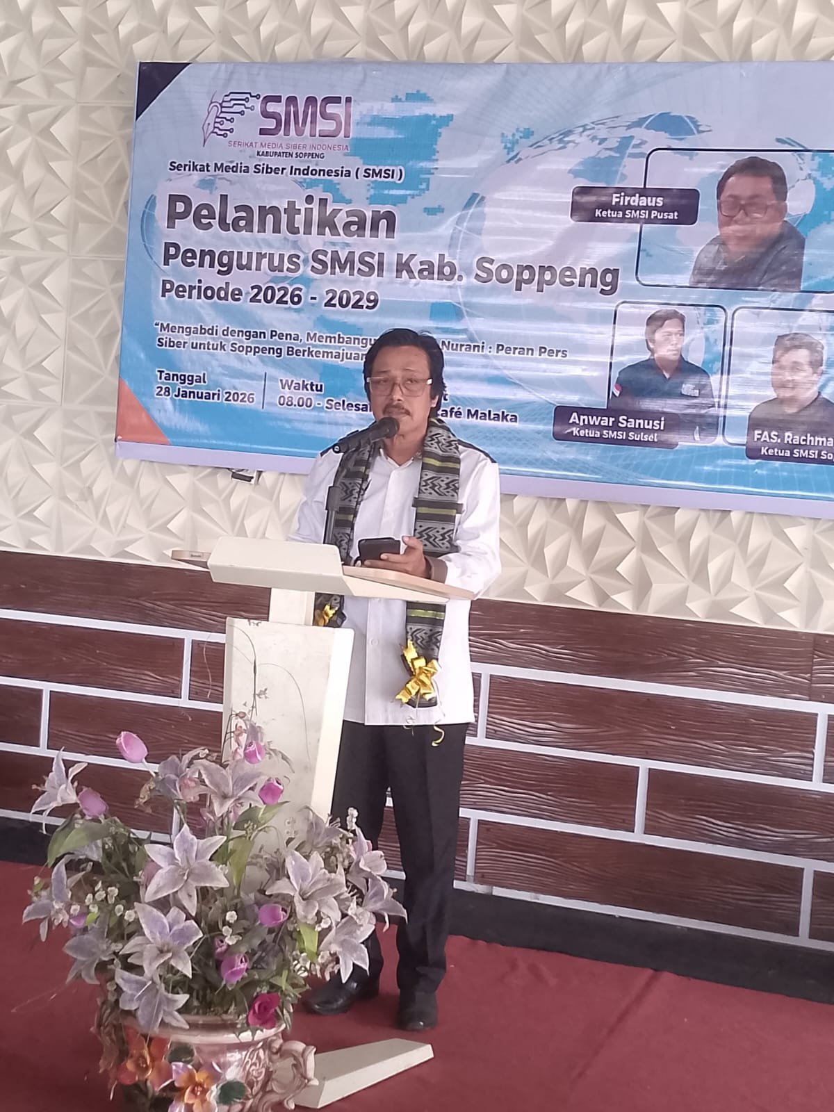 SOPPENG — Ketua SMSI Sulawesi Selatan, Anwar Sanusi, melantik Pengurus SMSI Kabupaten Soppeng periode 2026–2029 di Ruang Pertemuan Hark Cafe, Rabu (28/1/2026).